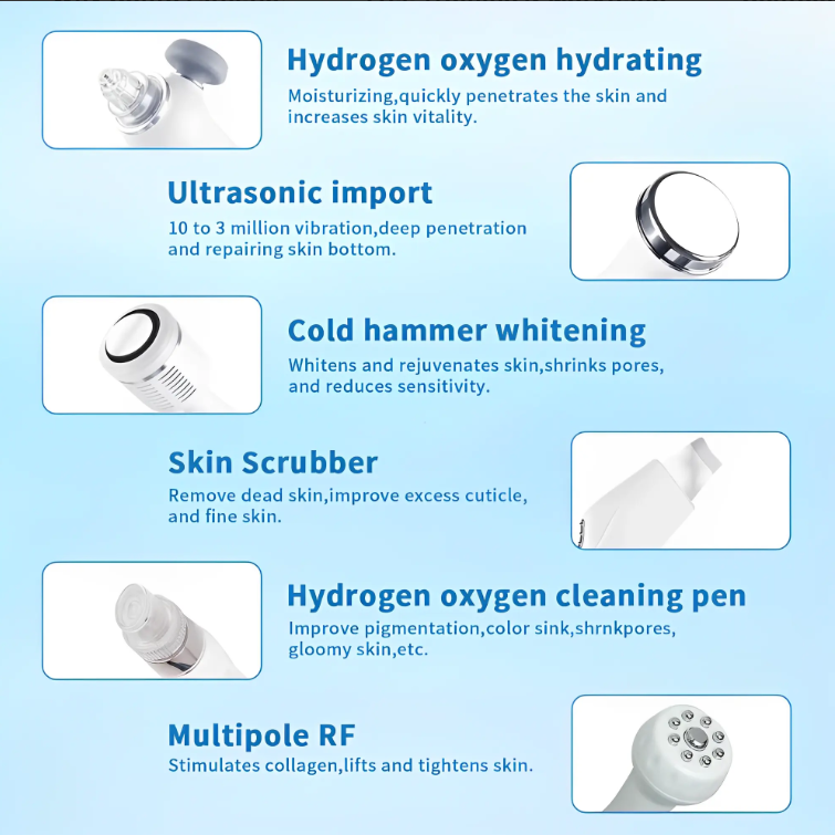 Using a combination of technologies like hydrogen-rich water, microdermabrasion, ultrasound therapy, radiofrequency (RF), and a cold hammer to promote collagen production, improve circulation, and leave skin looking smoother, brighter, and more radiant.Key Functions and Technologies: